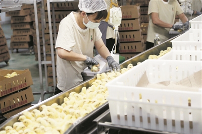 经过18天的孵化,一个个毛茸茸的小雏鸡在出雏筐中破壳而出,有的跌跌撞撞地挣扎着站立,有的张开羽翅、叽叽喳喳向外张望……雏鸡处理车间,是孵化中心生产流程最后一个环节。只见女工们从传送带快速夹握4只雏鸡查看发育情况,健康优质的雏鸡被留下,发育不良的雏鸡取出被淘汰,经相应处理后,即可出厂发往各地的白羽鸡养殖场。