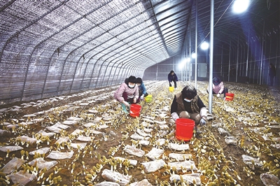 山东省莱西市夏格庄镇西夏格庄村,农民在大棚里采收羊肚菌。近日,山东青岛莱西市夏格庄镇种植的羊肚菌迎来丰收,种植户们忙着集中采收和加工。据了解,当地依托“强村共富公司”合作模式,以经济价值高的羊肚菌为突破口,整合上下游资源,推动村集体经济发展,形成集繁育、种植、加工、销售于一体的产业链,有效带动农民增收致富。李紫恒 摄