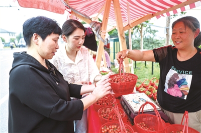 4月20日,种植户在同山镇的樱桃市集销售樱桃。近期,浙江省诸暨市同山镇的樱桃陆续进入丰收季,红彤彤的樱桃缀满枝头。为进一步促进农文旅体融合发展,同山镇举办了篮球比赛、樱桃采摘游、共富市集以及乡村赏花游等春季文旅活动,吸引游客前来感受春季乡村美景,推进农文体旅融合发展。徐昱 摄