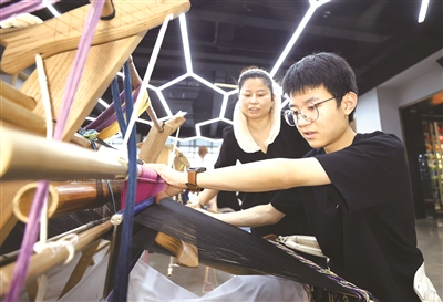 6月9日,大学生在张家界市乖幺妹土家族织锦文化创意园研学体验。2025年文化和自然遗产日将至,湖南省张家界市依托当地土家族织锦文化创意园推出特色非遗主题游览路线,在保护和传承民间工艺的基础上,进一步丰富旅游业态,提升旅游内涵。 吴勇兵 摄