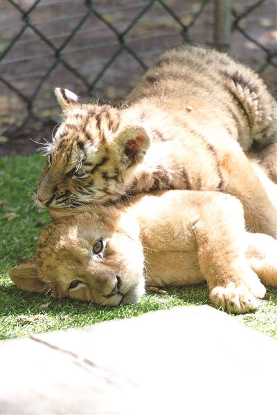 6月11日,在黑龙江东北虎林园,东北虎幼虎(上)和非洲狮幼狮一起玩耍。 位于哈尔滨市的黑龙江东北虎林园内的东北虎、非洲狮正值繁殖高峰期。目前,已陆续有12只东北虎幼虎、8只非洲狮幼狮降生。天气晴好时,小狮虎们被放入萌虎乐园中与游客见面,憨态可掬,惹人喜爱。 谢剑飞 摄