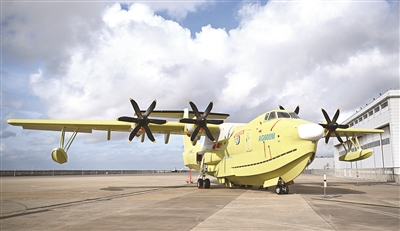 6月11日,在珠海中航通飞华南飞机工业有限公司,现场展示的批量生产的首架AG600飞机。 当日,我国完全自主研制的大型水陆两栖飞机AG600“鲲龙”在广东珠海获颁中国民航局生产许可证,标志着AG600飞机正式迈入批量生产阶段。 邓华 摄