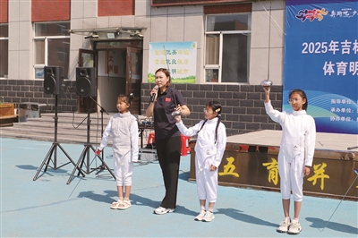 2025年吉林省体育支教志愿服务活动——“体育明星校园行”梨树站开幕式日前在梨树县第二实验小学校举行。活动点燃了梨树学子热爱体育、崇尚运动的热情,为校园注入蓬勃朝气。这是吉林师范大学体育学院院长李娜通过趣味游戏和动作指导,与现场学生亲切互动。