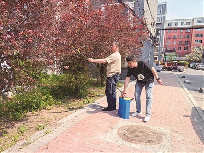 本报讯(全媒体记者 高鸿)为营造清洁干净的社区环境,更好地保障社区居民和谐生活,近日,铁西区站前街道新铁社区新开小区有居民反映,小区树木存在病虫害问题,有些还掉落到行人身上,给居民日常出行带来不便,影响辖区环境和居民生活。为预防虫害和疾病传染,还居民一个健康整洁的生活环境,新铁社区组织网格员在辖区内开展虫害树木情况排查以及除虫消杀工作。