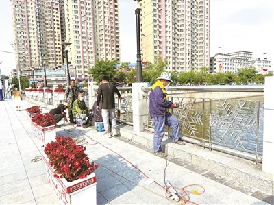 6月25日,市政部门工作人员在铁西区南河边对桥体铁护栏进行维护,恢复护栏原有的金属光泽和美观度,提升其使用寿命。