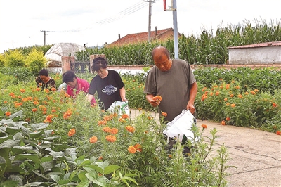 近年来,双辽市柳条乡积极探索“党建+合作社+农户”模式,引导各村农民利用闲置土地种植万寿菊,既美化了村屯环境,又增加了村集体收入,“小菊花”成为助农增收的“黄金花”。这是村民采摘万寿菊。