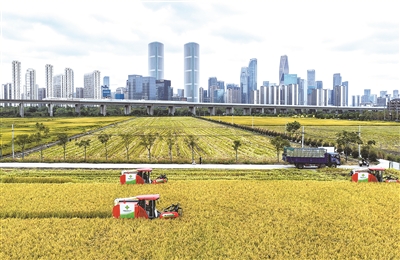 10月21日,收割机在稻田里收割水稻,远处高铁列车飞驰而过。 金秋时节,位于浙江杭州萧山区世纪田园粮食功能区的3000多亩水稻迎来丰收,金黄的稻田、飞驰而过的高铁列车和远处的城市天际线构成了独特的城市田园画卷。