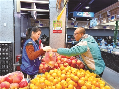 金秋时节,超市水果区洋溢着丰收的气息。梨、苹果、柿子等秋季时令水果摆满摊位,摊主热情地为顾客挑选、装袋,彰显了秋季水果市场的丰富供应,传递出市民在收获季节里享受新鲜果味的幸福感。