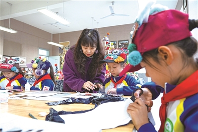 近日,淄博市博山区四十亩地小学教师韩晓英在辅导学生创作布贴画。 近年来,山东省淄博市博山区积极开展非遗进校园活动。目前,当地已成功引进非遗项目18项,13所学校在校本课程开发中融入非遗元素,通过课程化设计实现非遗的常态化传承,推动非遗教育与日常教学的有机结合。 新华社 朱峥 摄