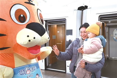 11月5日,准备乘坐“萌虎”主题列车的旅客在哈尔滨西站站台上与“萌虎”工作人员互动。 11月5日,中国铁路哈尔滨局集团有限公司哈尔滨客运段担当的G902次首趟“萌虎”主题列车从哈尔滨西站驶出,开往北京。列车以“龙江冰雪蓝”为基调,融合东北虎元素装饰车厢,让旅客在旅途中感受龙江冰雪文化的独特魅力。 徐率 摄
