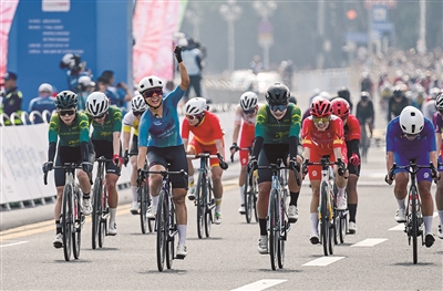 11月9日,香港队选手李思颖(前左二)在冲线后庆祝。最终,她夺得冠军。 当日,第十五届全国运动会公路自行车女子个人赛决赛举行。 连振 摄