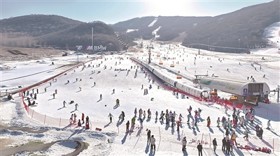 11月22日,吉林省2025-2026新雪季开板暨第31届吉林雾凇冰雪节开幕式在吉林市中旅松花湖度假区举行。图为现场络绎不绝的滑雪爱好者。