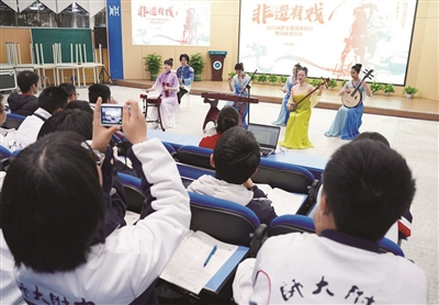 近日,“非遗有戏”2025成都非遗创演项目精品展演活动走进位于成都市的四川师大附中高中部,成都市非遗保护中心曲艺团演员为学生们表演了四川清音、四川扬琴、金钱板、川剧变脸等国家级非遗项目,让孩子们近距离感受传统艺术的独特魅力。