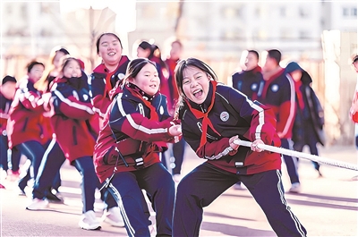 11月25日,内蒙古自治区呼和浩特市玉泉区石东路小学学生在操场上进行拔河比赛。该校积极推动校园体育活动“加时”“加量”,通过丰富体育课程、成立体育兴趣小组和社团等举措,让学生在快乐运动中锻炼身体、增强体质。