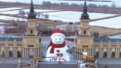 12月15日,哈尔滨市群力音乐公园大雪人完成主体建设,进入到最后的细节打磨阶段。大雪人设计身高19米、长14米、宽11米,总用雪量超过3000立方米,比往年增加1200立方米,为历年之最。这是12月15日在哈尔滨市群力音乐公园拍摄的大雪人。