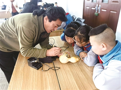 在四平市第十四中学校、第二十中学校、铁西区站前小学校、铁西区阳光实验小学校,省级非遗代表性传承人赵铁军示范葫芦雕刻技艺,讲述葫芦所承载的福禄吉祥的文化寓意,以及雕刻技艺的历史渊源。学生们手持电烙工具,小心翼翼地烙烫着葫芦表面,在赵铁军的指导下,一个个原本朴素的葫芦,逐渐被绘制出生动的卡通角色、吉祥的文字或孩童嬉戏的画面,尽显雕刻艺术的精妙与创造乐趣,传统技艺的魅力在指尖流淌。
