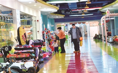 随着雪季到来,冰雪类玩具进入销售旺季。商场内,各类滑雪板、滑雪圈、雪地车等冰雪玩具吸引了不少家长和孩子前来挑选。这是铁东区万达广场内,家长带小朋友选购雪具。