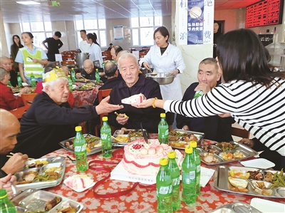 午餐时间,餐厅内生日蛋糕醒目摆放,老人们欢聚一堂、其乐融融。伴随着欢快的生日歌,大家共同许愿、切分蛋糕,在分享美食与真挚祝福的温馨氛围中,尽情享受幸福时光,老人们脸上洋溢着满足的笑容。