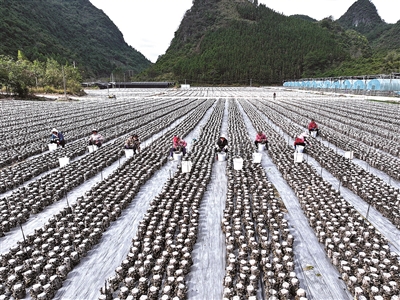 1月5日,广西河池市罗城仫佬族自治县东门镇大福村村民在采收黑木耳(无人机照片)。当日是小寒节气,各地农民抢抓农时,有序开展农事活动。